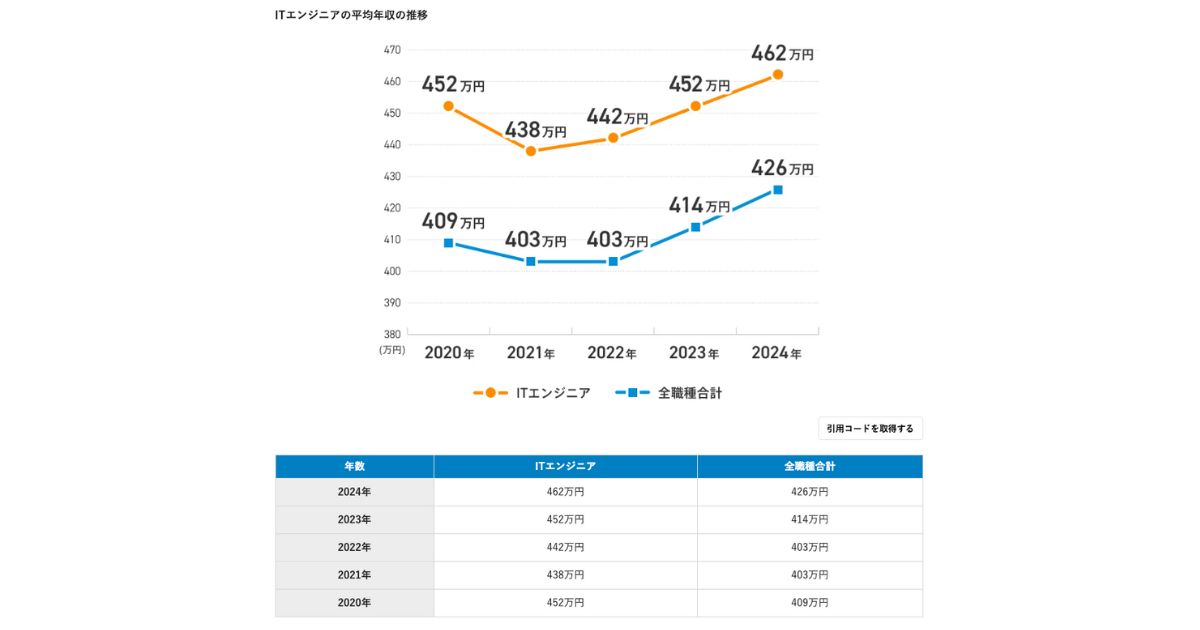 2024年の会社員ITエンジニアの平均年収は462万円で、2020年から5年間では430万円から460万円代の間で推移しています。